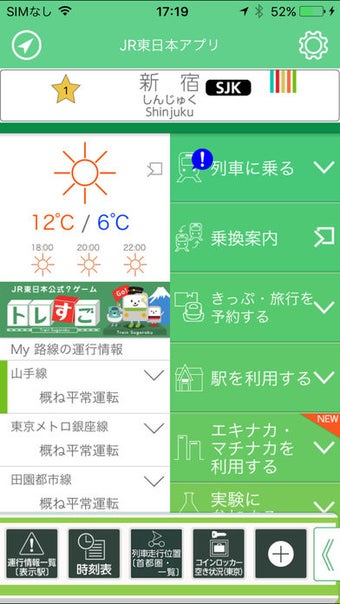 JR東日本を起動するとMy路線とMy駅の設定画面が表示されますが、My路線・My駅を登録せずに利用することもできます。いったん登録すると、JRの各駅を表示させた際にその駅の現在の気温やMy路線の列車の運行情報が表示されます。駅情報はJR東日本の約1700駅が網羅されています。JR各駅のメニューには、運行情報などをチェックできる「列車に乗る」、駅構内図や時刻表を確認できる「駅を利用する」、駅構内や近辺のお店や施設情報がわかる「エキナカ・マチナカを利用する」などが用意されています。「スキマ時間を楽しむ」というメニューは残念ながら調整中だったので、電車を利用するときにつきもののコマ切れの時間を活用できるコンテンツに期待したいところです。